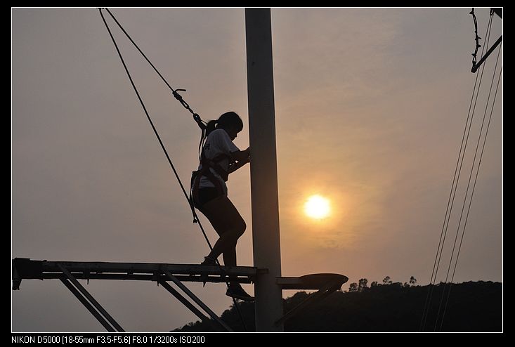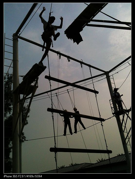 我是我们小组第一个上去的女孩子。爬梯上去的时候,我明显地感觉自己的腿在抖,上下的牙齿也在咯吱咯吱的不停的敲打着,怎么控制都控制不住。最后爬上断桥后往下一看,脑子一片空白了……深呼吸三次,预备三次,还是不敢跳过去。第四次,我再作一次深呼吸,心里默念:我相信你们!勇敢的跨出我的脚步,起跳,越过,落地!我成功了!!!那一刻,我差点热泪盈眶!颤抖的回到地面——感觉真的太好了,我也勇敢的突破自己了!