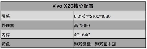 这里,笔者列举了一些和游戏挂钩的核心配置,供大家参考。vivo X20搭载6.01英寸分辨率为2160*1080的全面屏,内置高通骁龙660移动平台,并且采用了4GB RAM+64GB ROM的存储搭配。从各方面消息来看,虽说骁龙660处在600系列,但游戏表现却是不输任何一款旗舰芯片。实际体验如何?接着往下看。