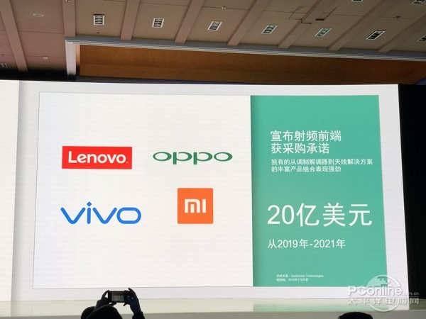 来自OPPO、vivo和小米的技术副总等都陆续上台发言,表示各自在射频技术方面的发展和技术储备,当然,都离不开高通一直以来的支持。包括联想在内的四家企业,承诺了2019-2021年的4G/5G射频前端采购量达到20亿美元。