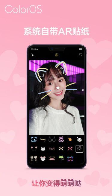 ColorOS 5.0 还有一项好玩有趣的新功能:AR 贴纸。不论自拍还是他拍,不用额外下载其他 app,随时能在镜头里戴上一顶奇妙的帽子,或者长出一对粉嫩兔耳朵,甚至变成一只小猴子,简直萌爆了。