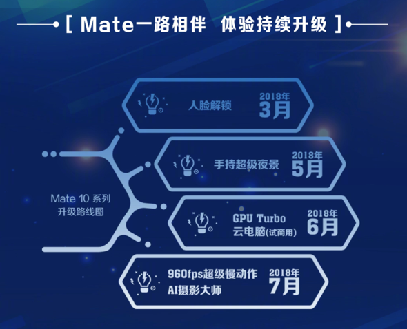 为了给用户带来更好体验:3月,华为Mate 10系列就通过软件更新,响应用户对于人脸识别潮流的呼声,增加了人脸识别功能;5月,华为Mate 10系列又加入了手持超级夜景模式,使其夜拍能力得到大幅度提升;6月,华为Mate 10系列率先实现GPU Turbo技术升级,此外还有配合投屏功能秒变云端电脑的黑科技——云电脑(限量尝鲜);7月中旬,即将迎来的EMUI 8.1系统,增加960fps超级慢动作拍摄、AI摄影大师。