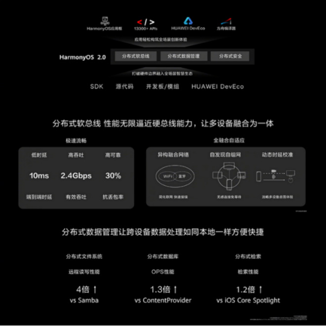 HarmonyOS 2.0 打破软硬件壁垒融入全场景生态,分布式软总线在升级,多设备融合为“一个设备”,并且能带来极速体验,低延时、高吞吐,自适应全融合,一切尽在全自动后台处理,此外采用的分布式数据管理让跨设备数据访问如同在本地访问一样方便,