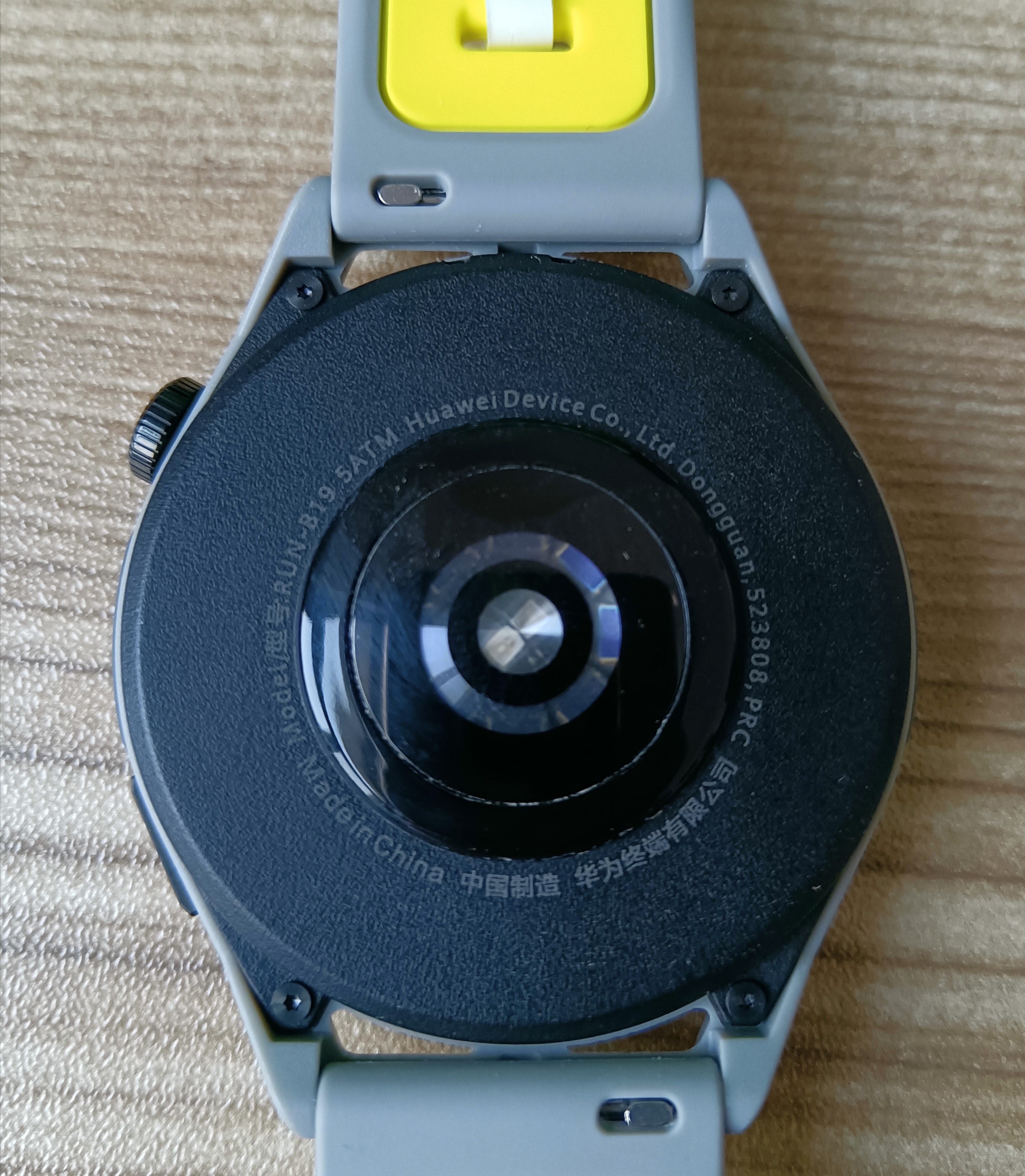 手表背面,除了光电心率外,没有了充电电极接头,因为HUAWEI WATCH GTRunner 支持无线充电功能,由于无线充电底座没有金属触点,也减少了金属过敏人群皮肤过敏的可能性。无线充电技术更重要的一个能力是反向充电,所以如果你的华为手机(支持无线充电功能)在电量即将耗光的关键时刻,我们可以把手表的电量反输给手机,进行关键救急!