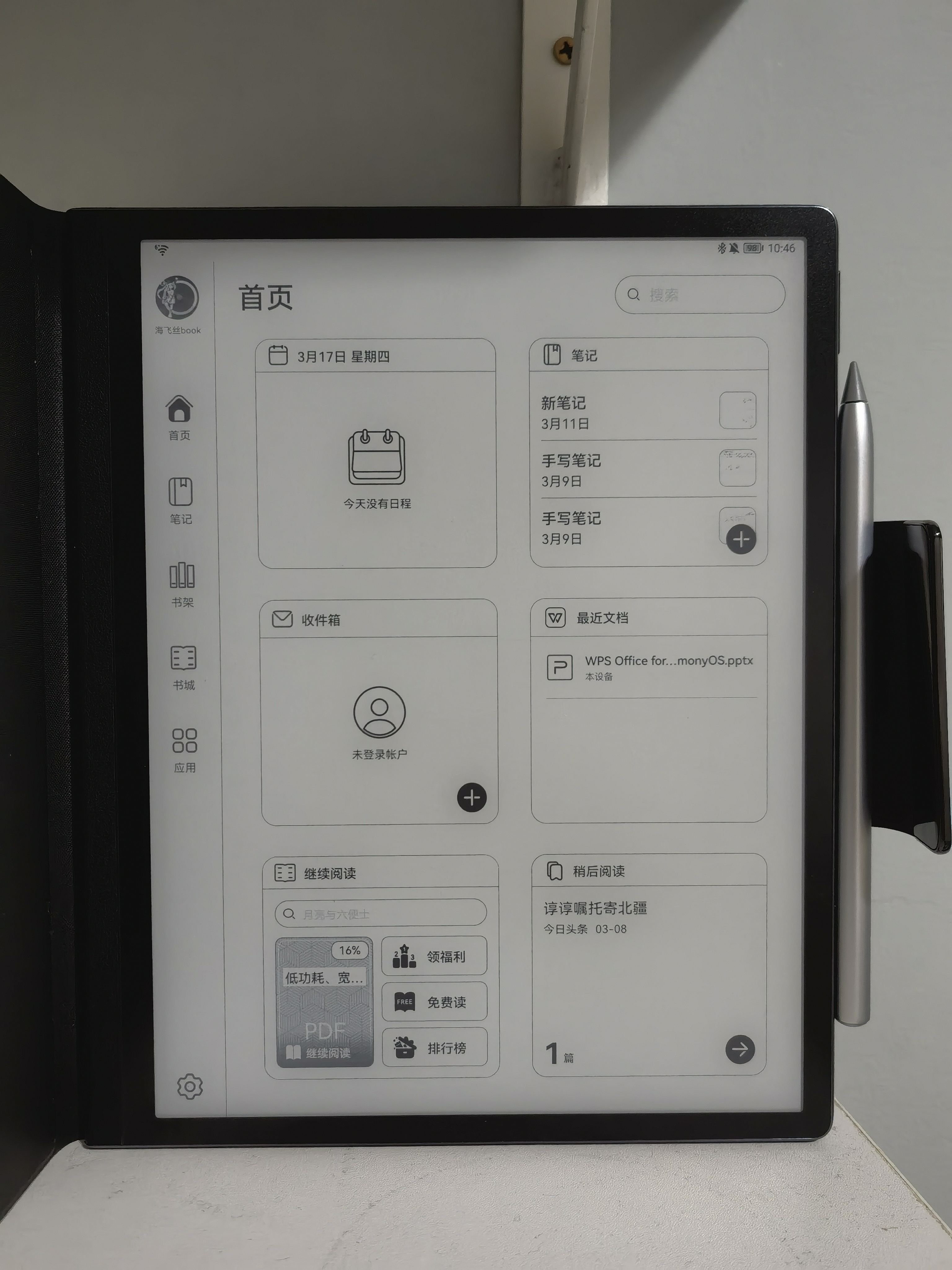 主页的设计干净简约,线条较少。左侧一栏是功能选项,笔记、书城、书架、应用这些常用的功能,最近阅读过的图书、文档和日程安排、邮件通知都在主页显示,一步就能触达想要打开的应用。