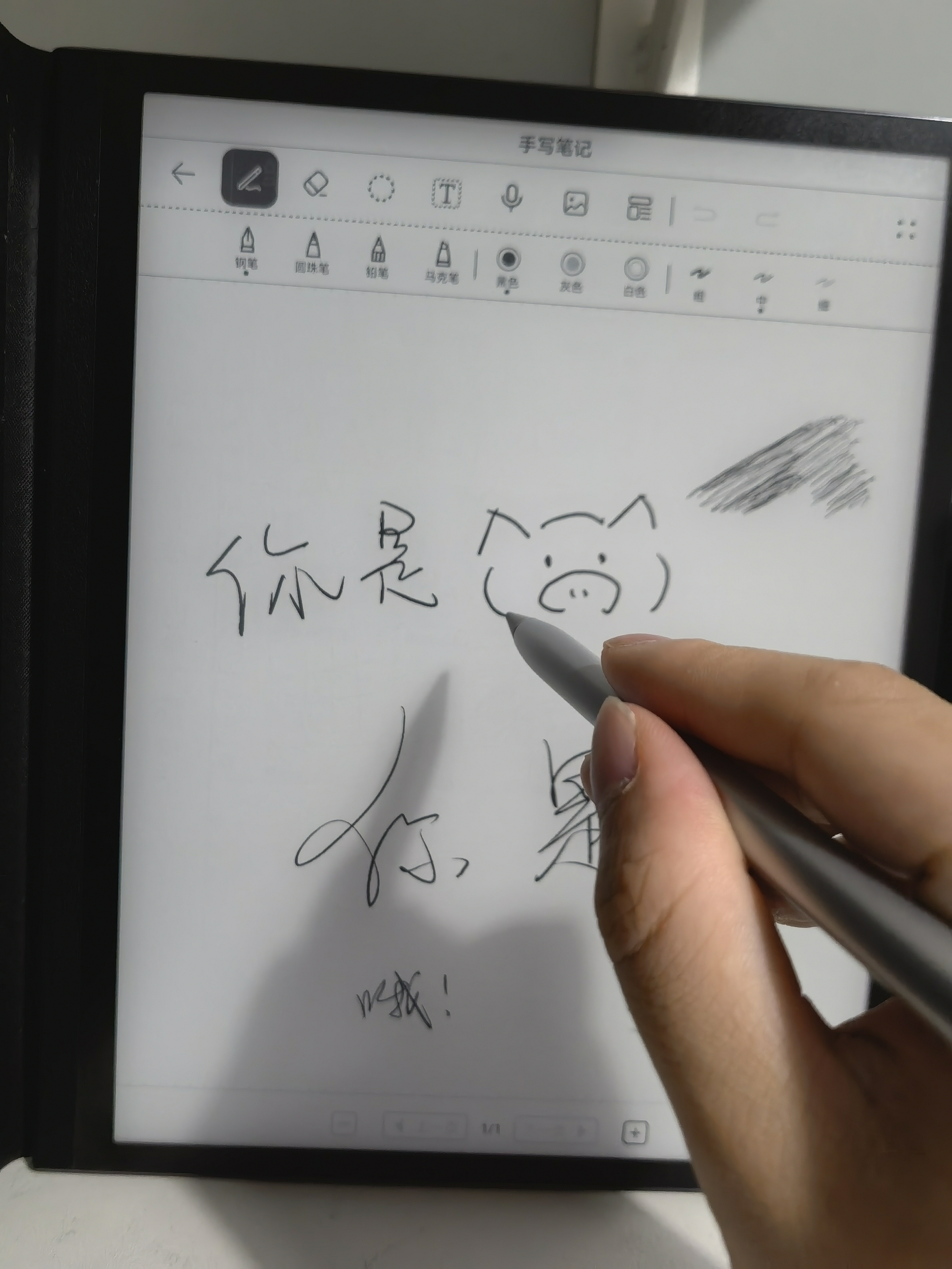 盒子里附送了一支M-Pencil二代,这支M-Pencil用的是非透明的笔尖,在墨水屏上书写时会有类似在纸张书写的阻尼感,能听到沙沙摩擦的声音,格外带感。