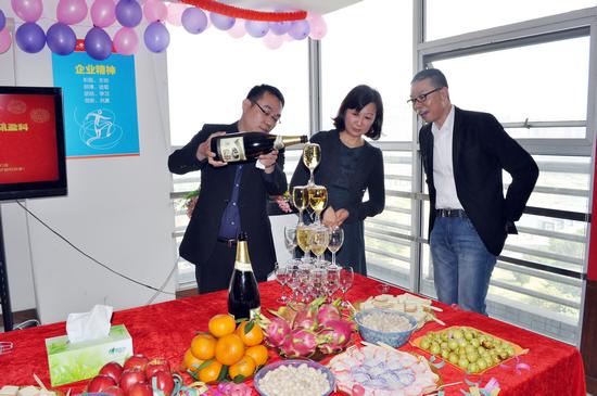 2010年11月,捷通达与香港电信盈科正式搭成合作框架!合作启动会上,总经理甘浩川(左一)倒香槟。