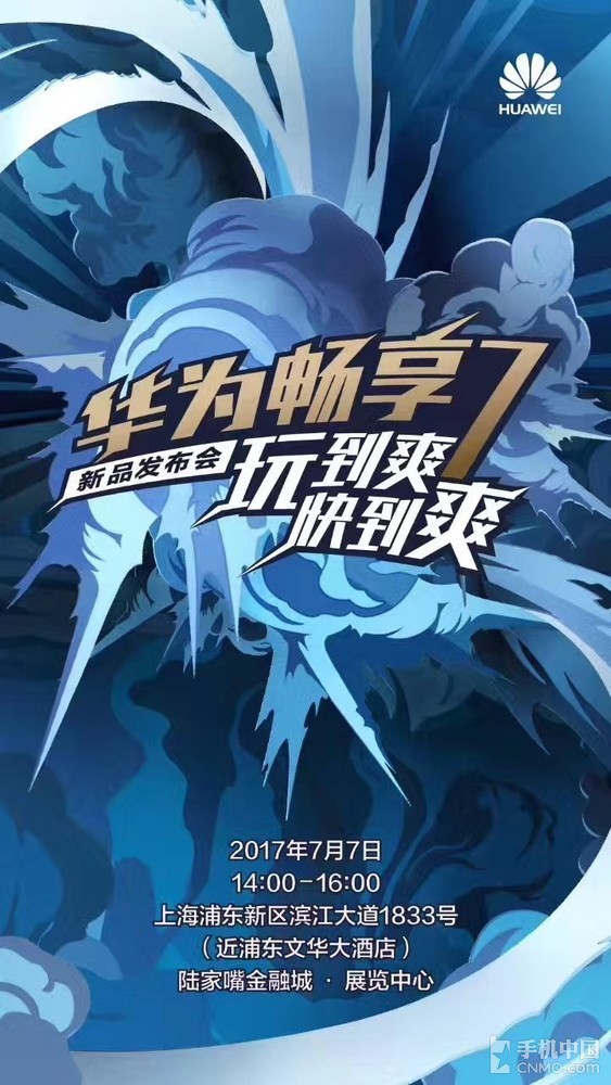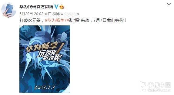 @华为终端官方微博发布海报,并表示华为畅享7将在7月7号正式发布。结合华为内部人员的消息,该机具体将在当天下午2点亮相,至于发布会地点则选在了上海陆家嘴金融城·展览中心。