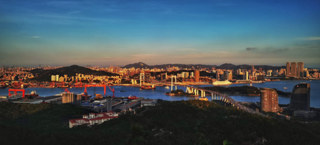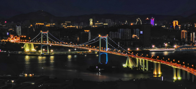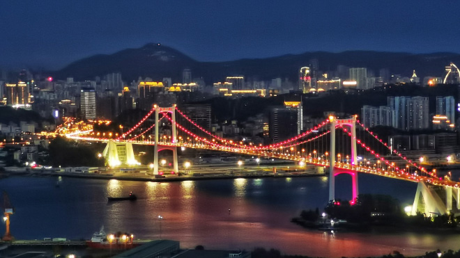 夕阳下的邮轮中心和海沧大桥