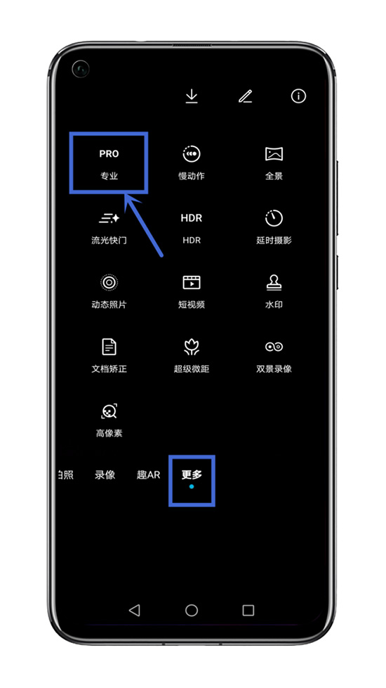 打开相机,向左滑动,滑到更多,可以看到一个‘专业PRO