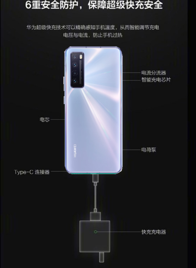 Super Charge超级快充技术华为nova7系列一大亮点,而且是不为人知的,华为40W快充提供了6重安全防护,可以精准感知手温度,从而智能调节充电电压与电流,防止手机过热,同时通过了德国莱茵TUV安全认证。而超级快充相比快速充电、普通充电优势更明显,主要表现为充电更智能、充电更快速、充电更安全。