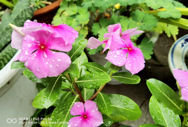 雨后小院内的盆栽植物,花瓣上的滴滴雨珠晶莹剔透。