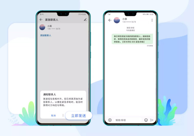 如要添加新的紧急联系人,手机界面会出现是否发送短信通知联系人的提示弹窗,选择“立即发送”后,对方将收到一条通知短信,同时用户手机的紧急联系人列表界面中也会出现“已发送短信通知联系人”的提醒消息。