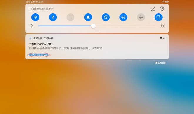 通过平板下拉通知栏可以实现快速切换协同出声设备,选择协同后在手机还是平板侧出声。