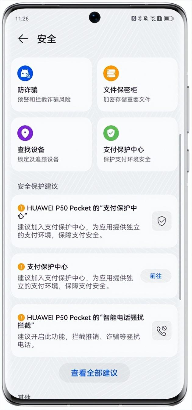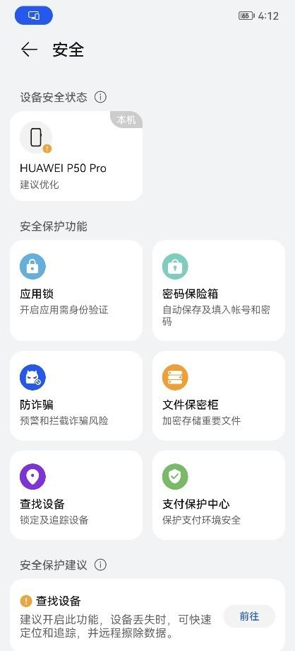进入安全中心后,如果其他设备存在健康问题,如未开启查找设备等,点击进去查看详情,按照安全保护建议逐个修复。